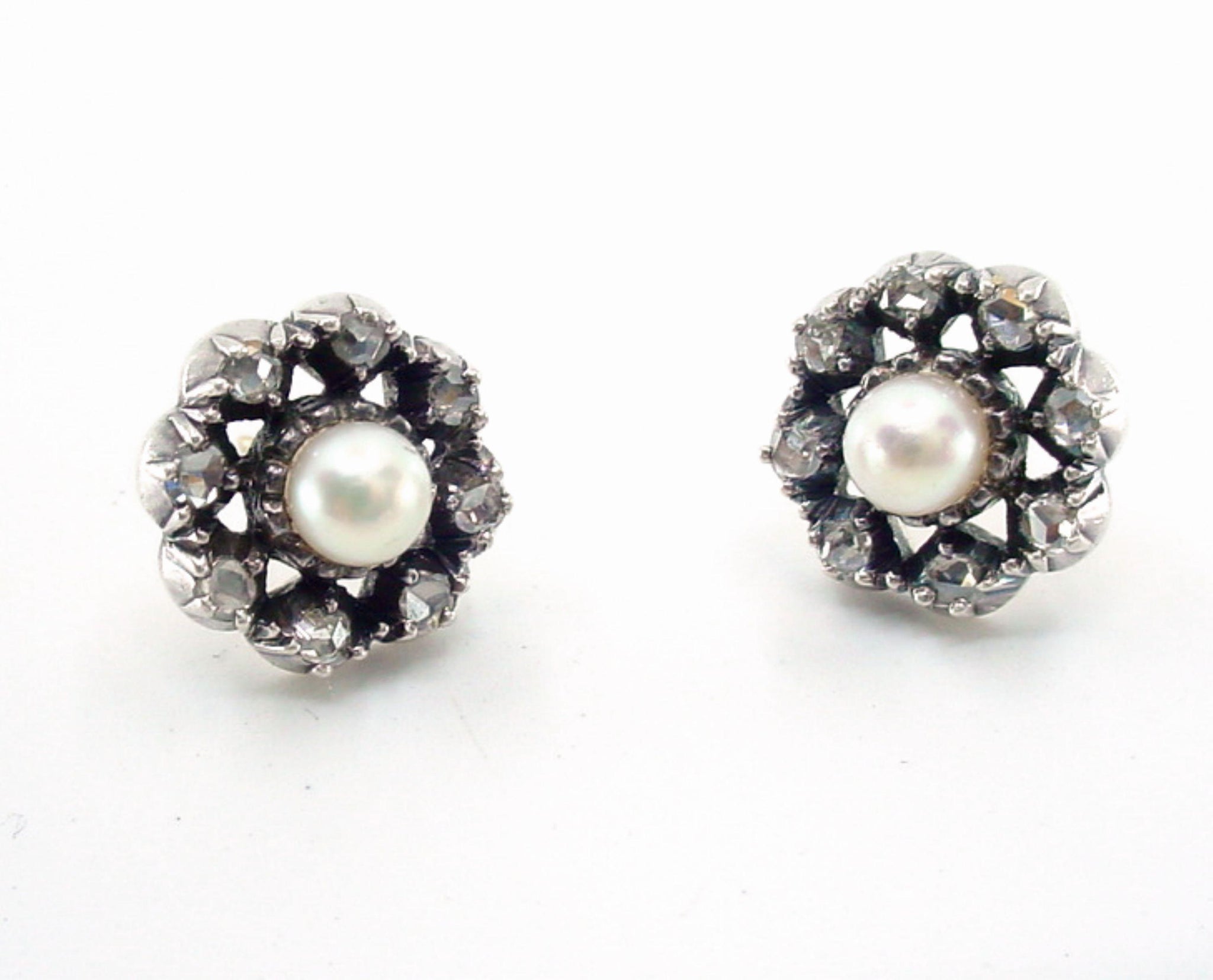 A pair of pearl and diamond earrings each set with a 5mm cultured pearl and antique-cut diamonds, mounted in silver and 14k gold.