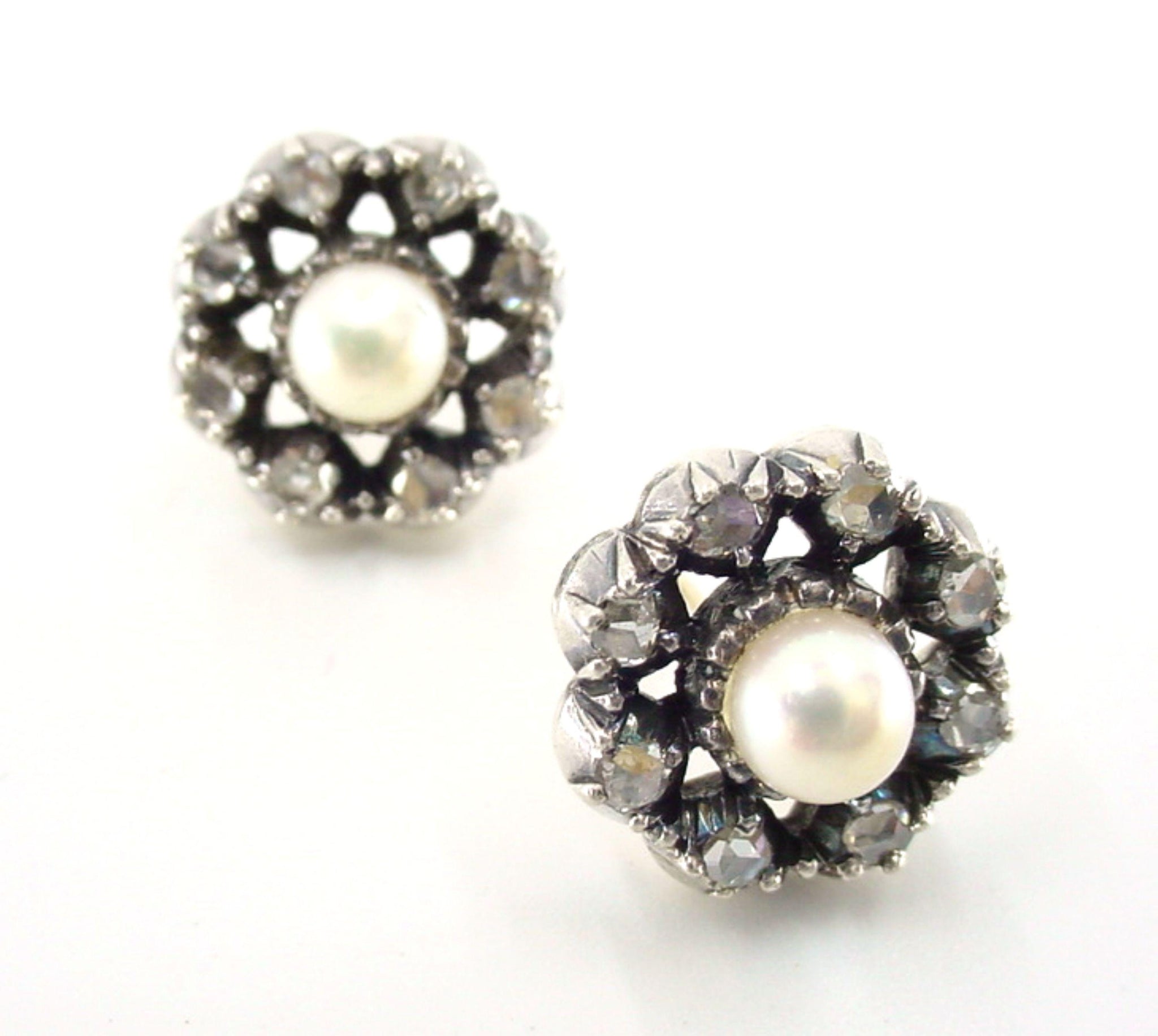 Antique Edwardian Diamond Pearl Halo Silver Top Gold Earrings--European