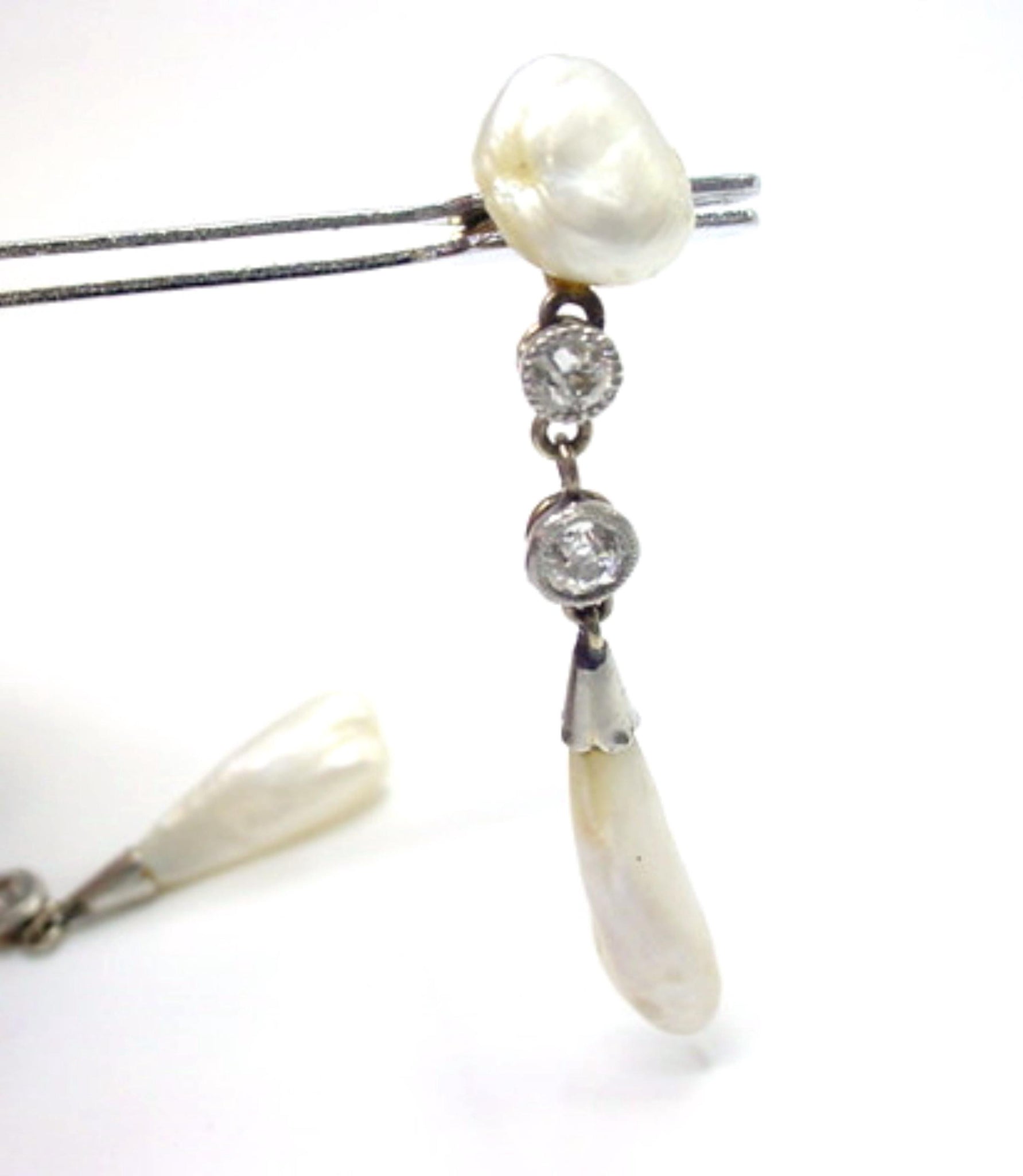 Vintage Edwardian River Pearl Diamond Platinum Gold Drop Earrings