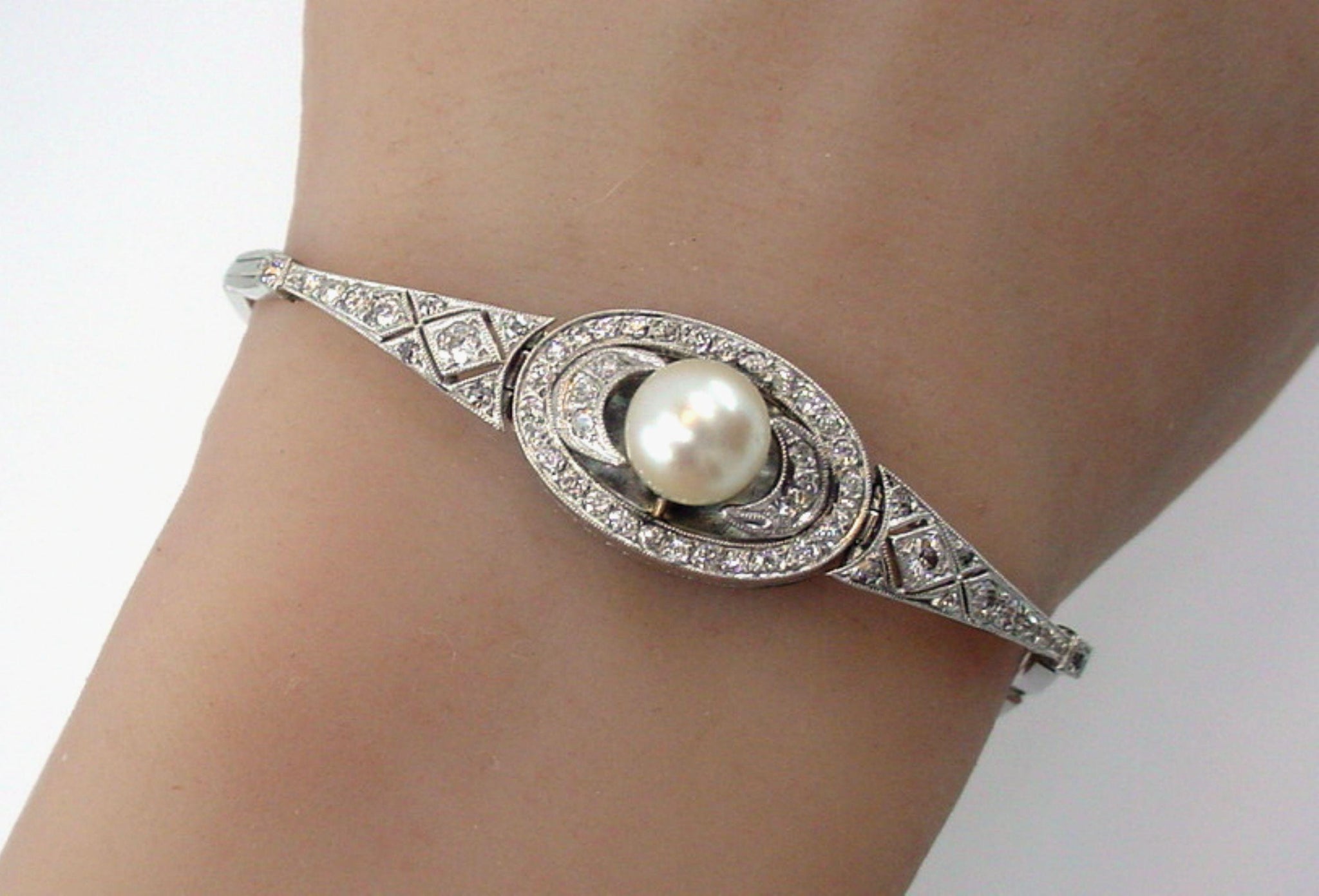 This bracelet conversion set with a central pearl encircled by numerous diamonds.