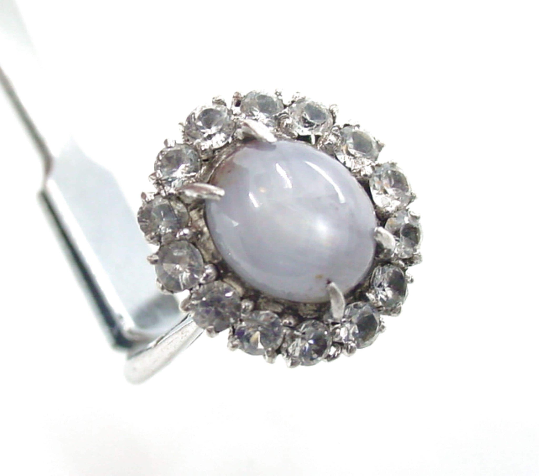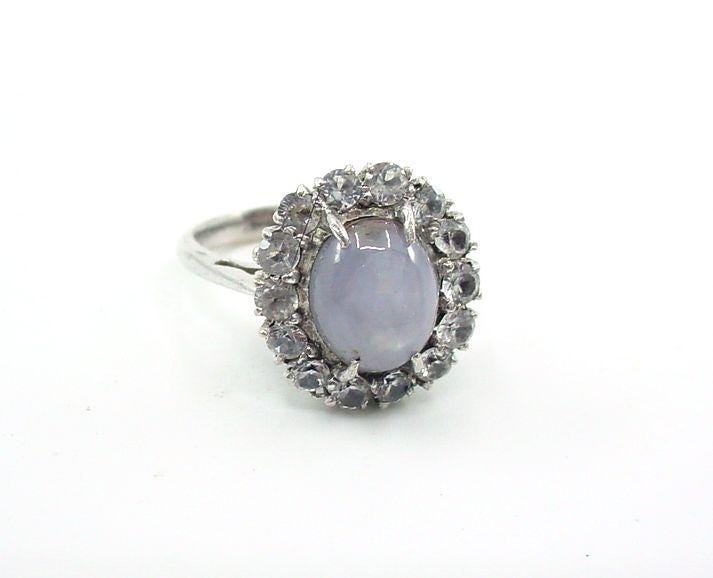 A star sapphire ring (and bracelet) set with a cabochon star sapphire encircled by faceted white sapphires, mounted in rhodium-plated silver.
