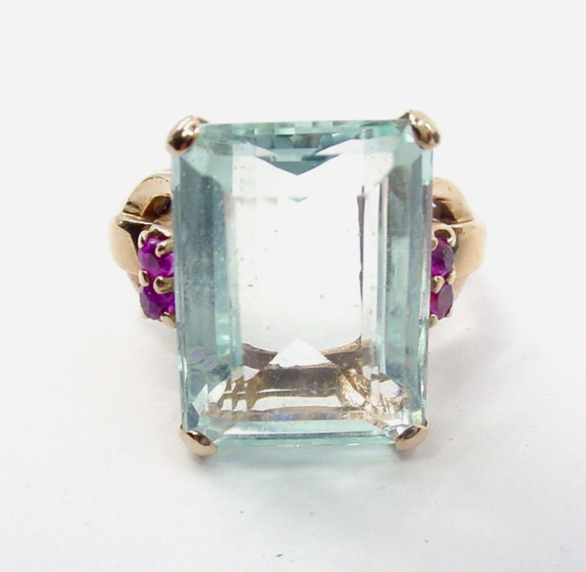 Stunning Retro 1940s Aquamarine Ruby 14k Rose Gold Cocktail Ring